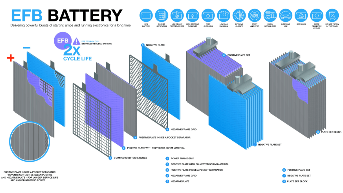 EFB batteries are an improved variant of the traditional wet-flooded technology. These batteries are designed for entry-level use and uniquely utilize gel battery chemistry, making them suitable for stop-start vehicles. The charging and discharging cycles for these vehicles need to be fast and frequent.